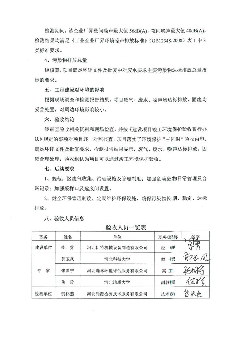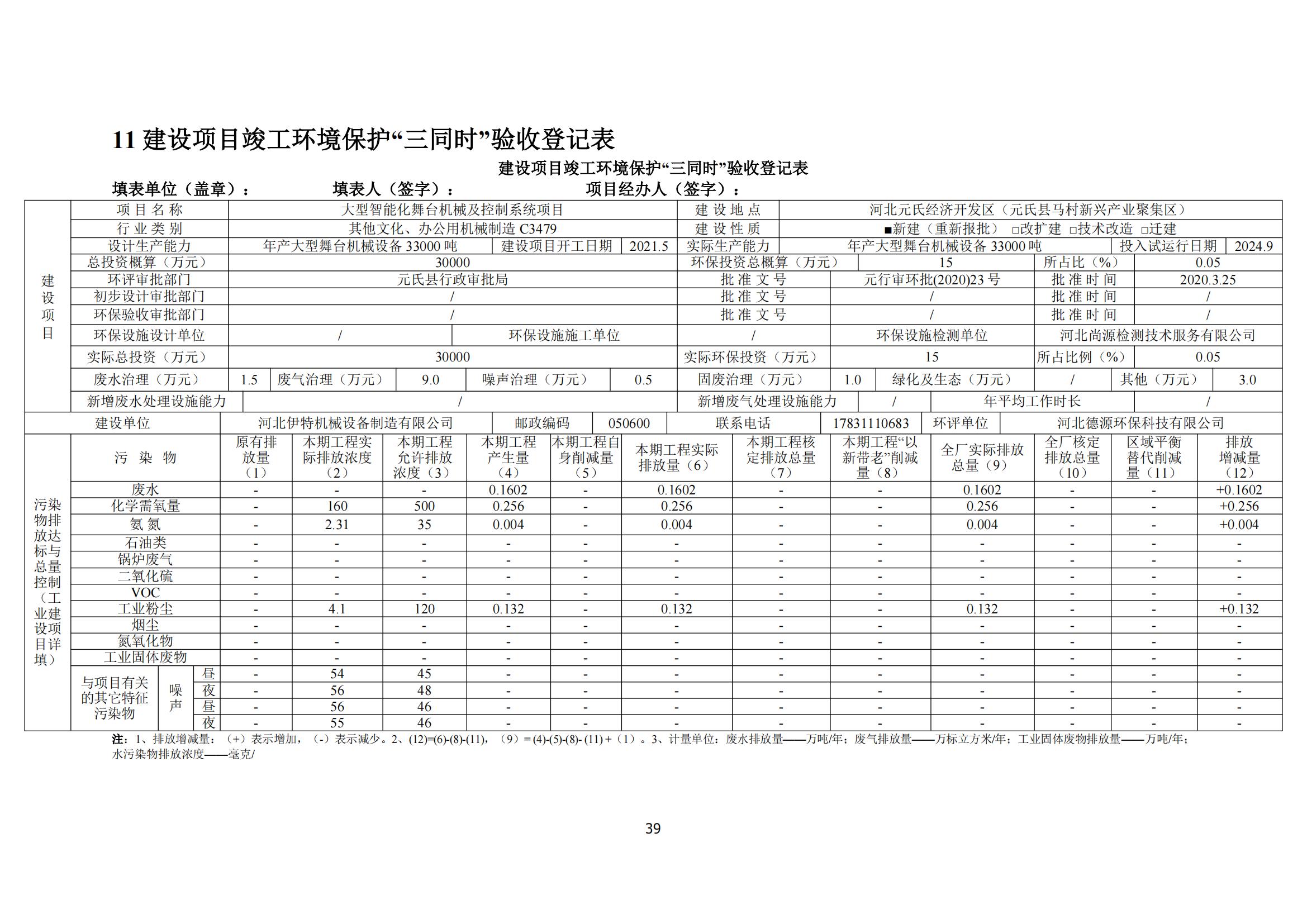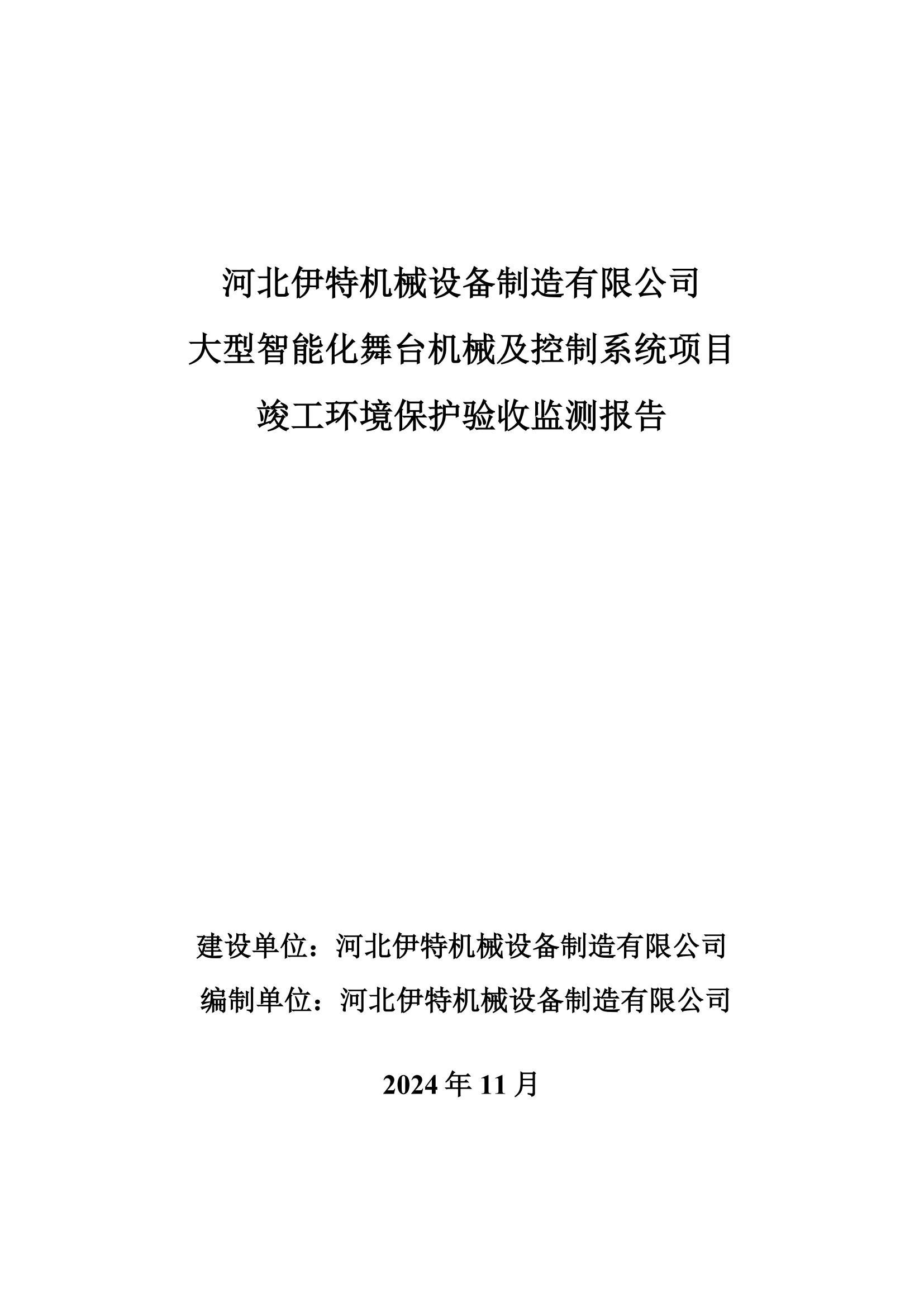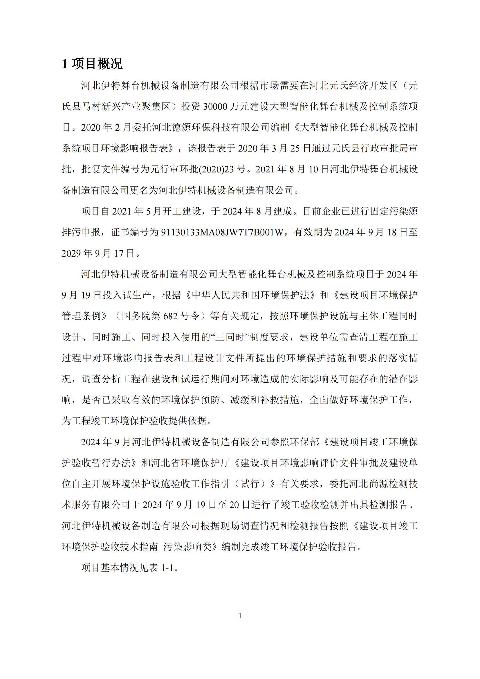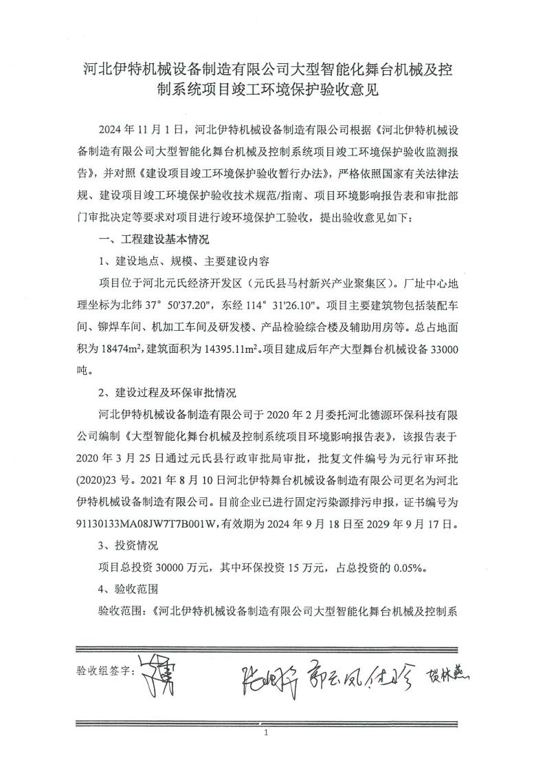 根據(jù)《國院關(guān)于改<建設(shè)項(xiàng)目環(huán)保護(hù)管理?xiàng)l例>的決定》(國務(wù)院令第682號(hào))以及生態(tài)環(huán)境部《建設(shè)項(xiàng)目竣工環(huán)境保護(hù)驗(yàn)收暫行辦法》和河北省環(huán)境保護(hù)廳《建設(shè)項(xiàng)目環(huán)境影響評(píng)價(jià)文件審批及建設(shè)單位自主開展環(huán)境保護(hù)設(shè)施驗(yàn)收工作指引(試行)的通知》(冀環(huán)辦字[2017]727號(hào))有關(guān)要求,現(xiàn)將河北伊特機(jī)械設(shè)備制造有限公司《河北伊特機(jī)械設(shè)備制造有限公司大型智能化舞臺(tái)機(jī)械及控制系統(tǒng)項(xiàng)目竣工環(huán)境保護(hù)驗(yàn)收監(jiān)測報(bào)告)公示如下: